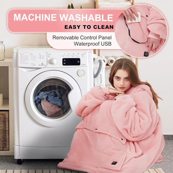 Answer 2: The blanket hoodie is machine washable, allowing for easy maintenance and cleanliness.